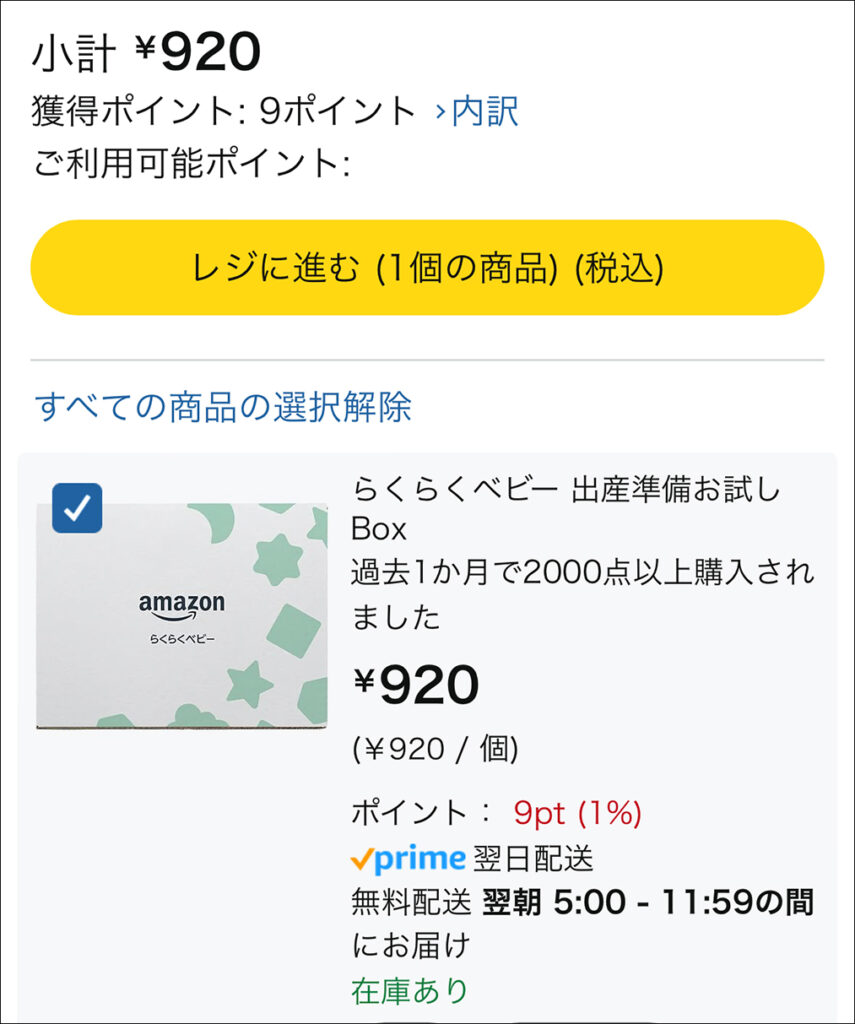 マイベビーリストを経由せずに直接カートへ入れてしまったり、「今すぐ買う」での注文には割引が適用されないので、少し手間ではありますが必ず「マイベビーリスト」からカートに追加して購入してください。